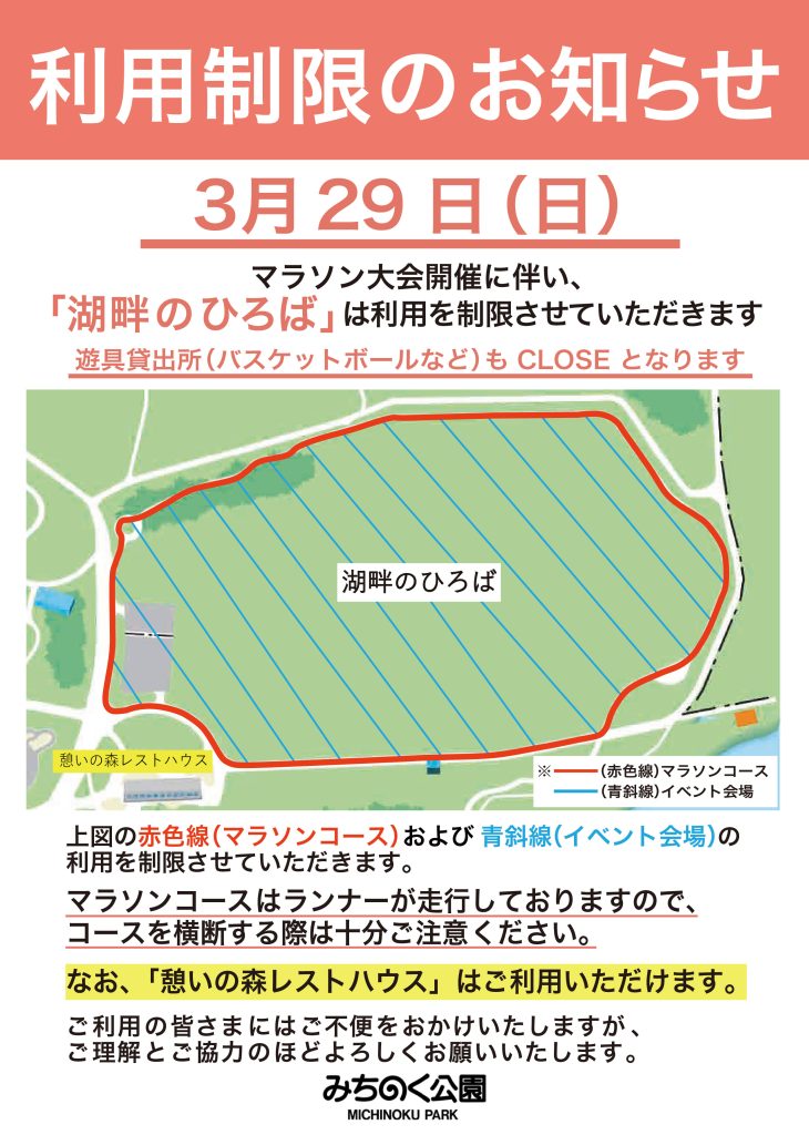 2026.02.20 3/29(日)「湖畔のひろば」利用制限について マラソン大会開催に伴い、3/29(日)は、南地区「湖畔のひろば」の利用を制限させていただきます。ご利用の皆さまにはご不便をおかけいたしますが、ご理解ご協力のほどよろしくお願いいたします。「遊具貸出所(バスケットボールなど)」もCLOSEとなります。 詳しくはこちらをご覧ください