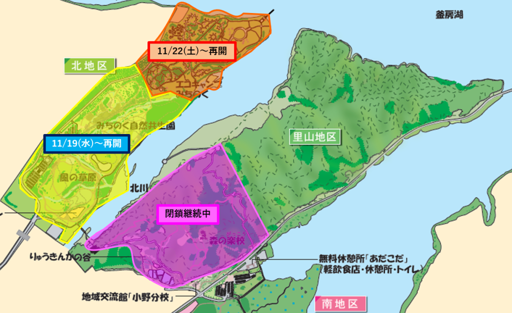 ※北地区内キャンプ場「エコキャンプみちのく」の利用再開につきましては、11/22(土)から再開を予定しています。