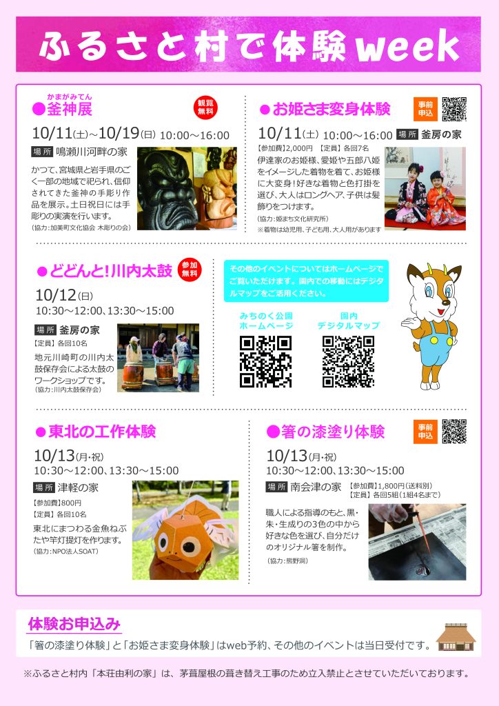 10/11(土)~10/19(日)の期間、南地区ふるさと村で『ふるさと村体験week』を開催いたします。
