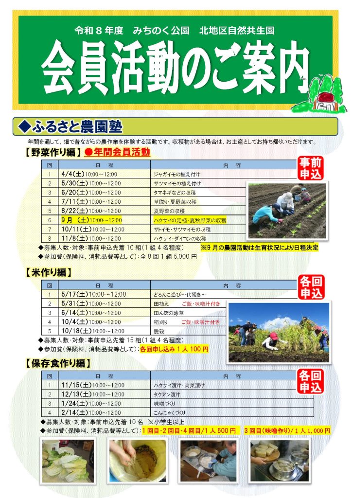 2025.02.15 北地区 自然共生園 年間会員活動(イベント)のご案内 北地区 自然共生園では、年間を通して野菜作り・米作り、食体験等の年間会員活動(イベント)を実施いたします。 年間でご参加いただける活動と単発でもご参加いただける活動がございます。みなさまのご参加をお待ちしております! 詳しくは以下のチラシをご覧ください↓↓