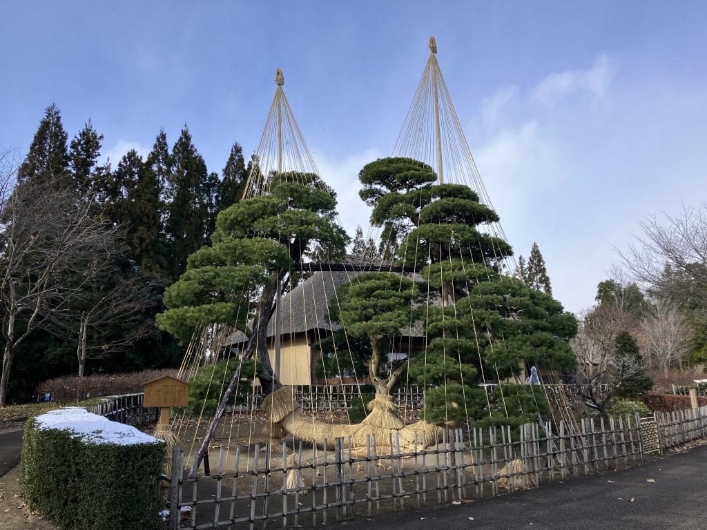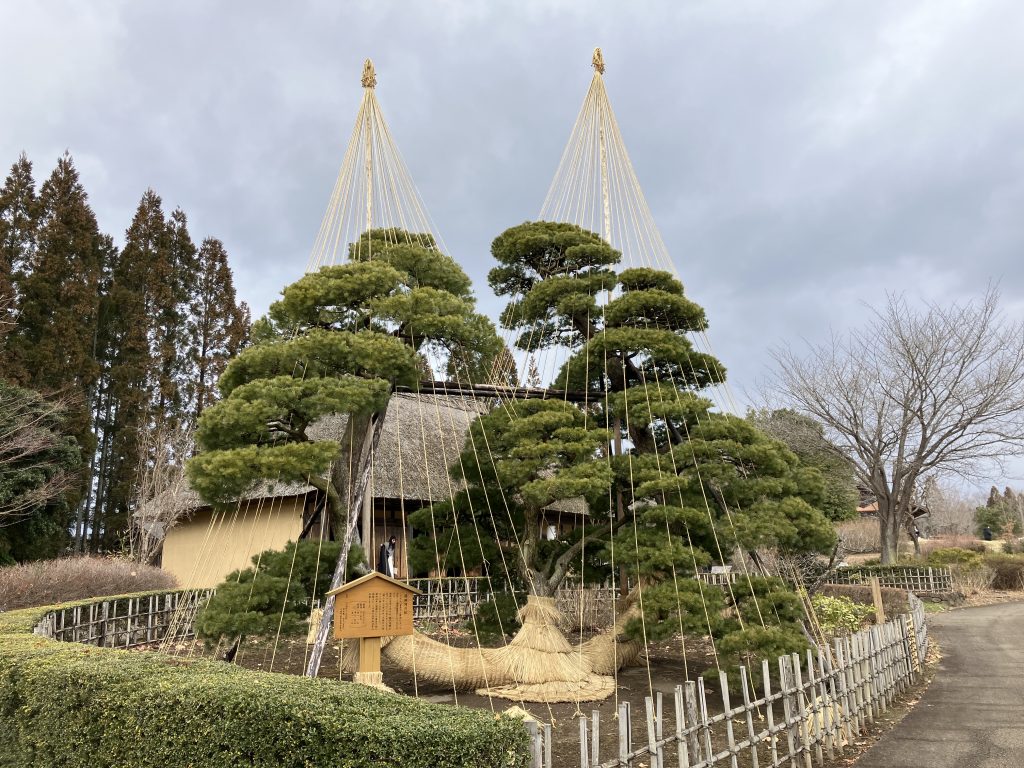 ふるさと村釜房の家前にて、雪吊りしている「湯田河のマツ」をご覧いただけます。