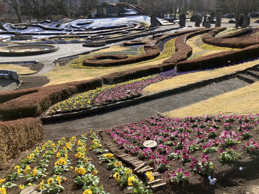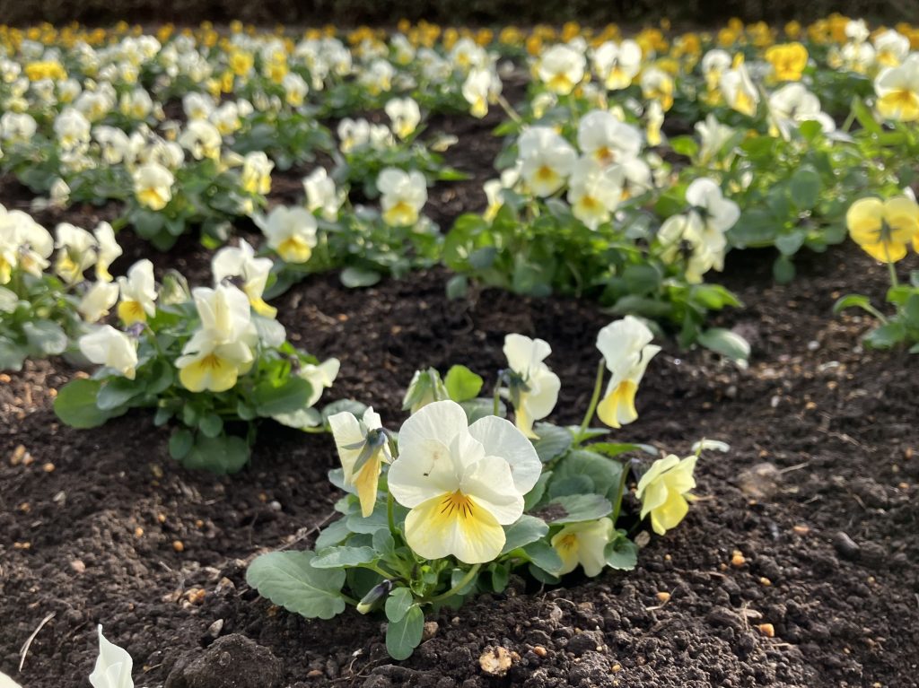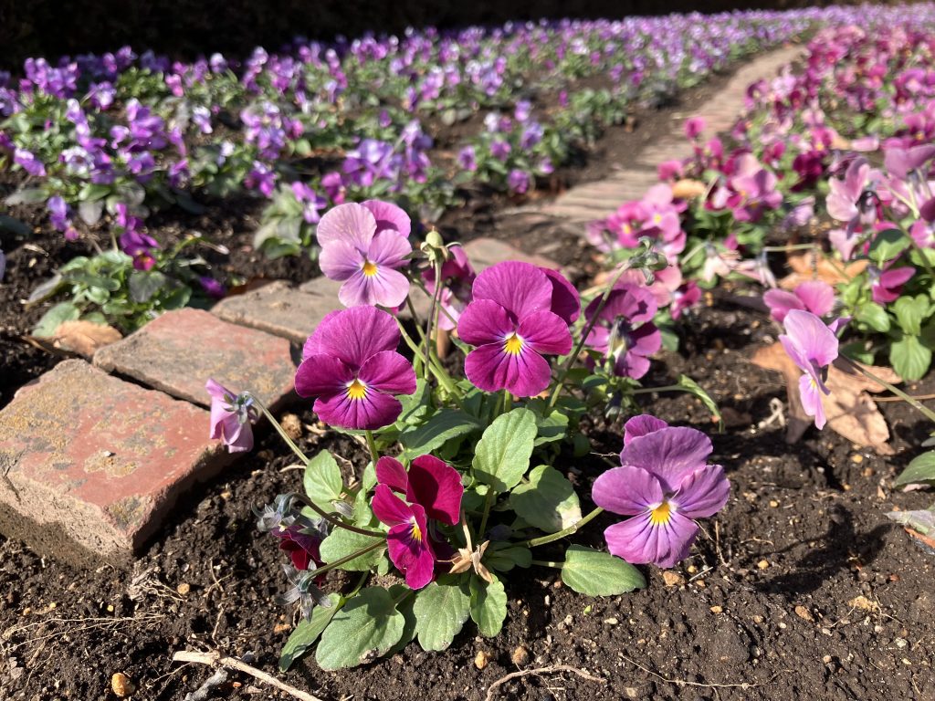 大花壇にて、パンジーとビオラが見頃始めとなっております。
