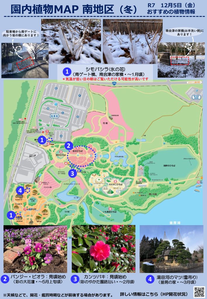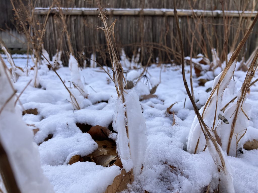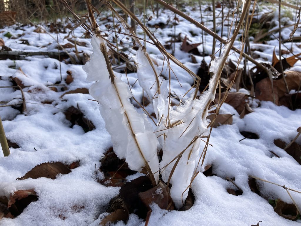 南ゲート横と南会津の家横にて、気温の低い日の朝のみにはなりますが、シモバシラの氷の花がご覧いただけます。