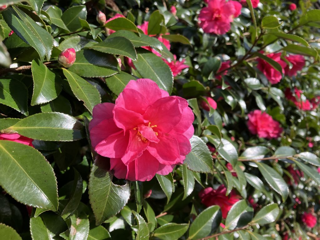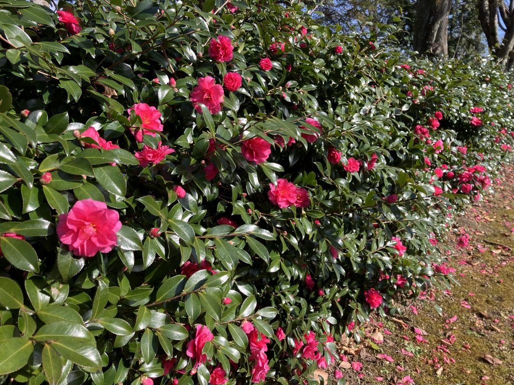 彩のやかた横~わらすこ広場付近の園路沿いにて、カンツバキが見頃始めとなっております。