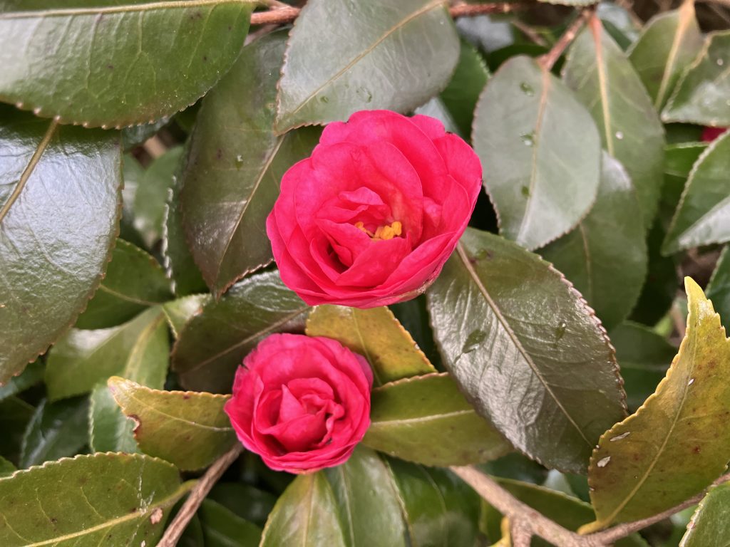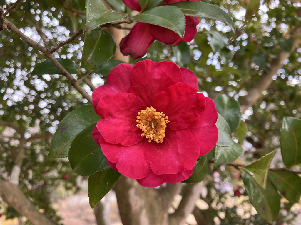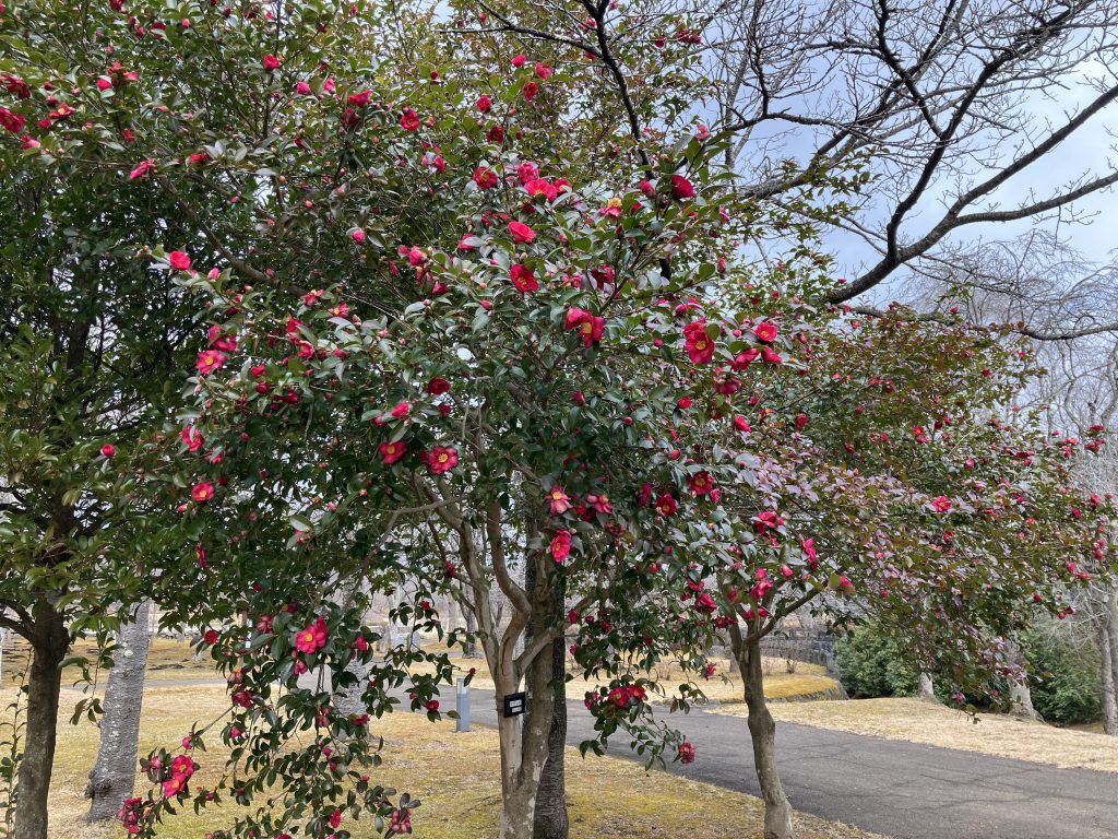彩のやかた横~わらすこ広場付近の園路にて、カンツバキが見頃後半となっています。