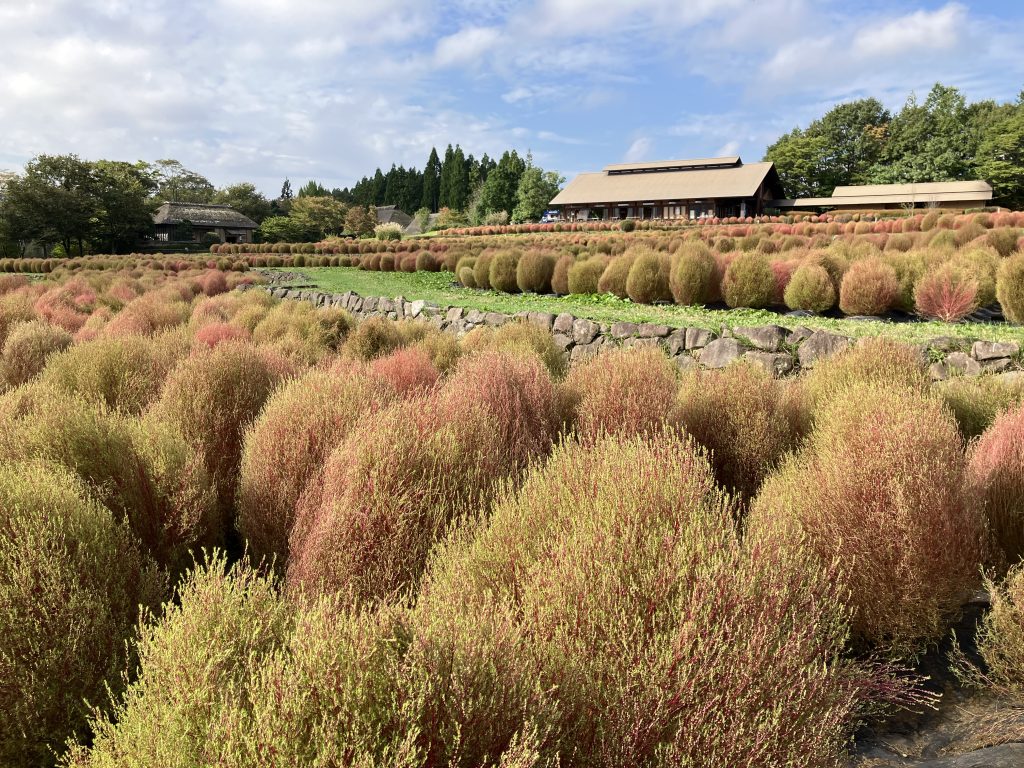 だんだん畑と大花壇(一部)のコキアが、色づき始めてきています。