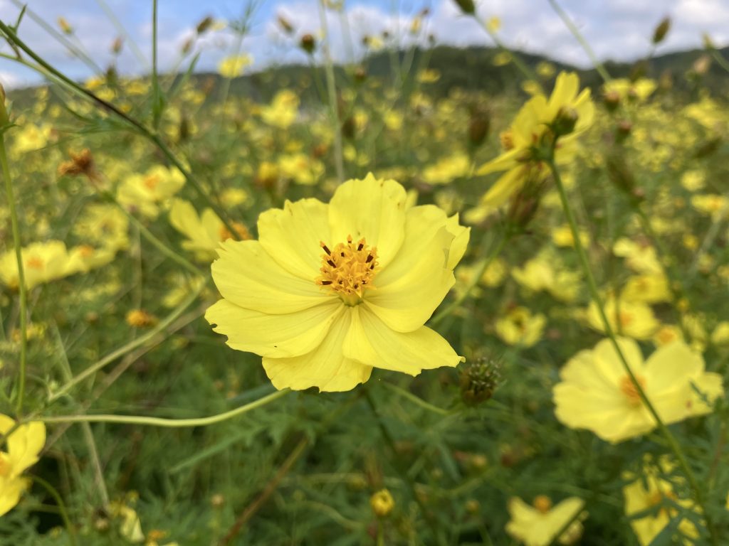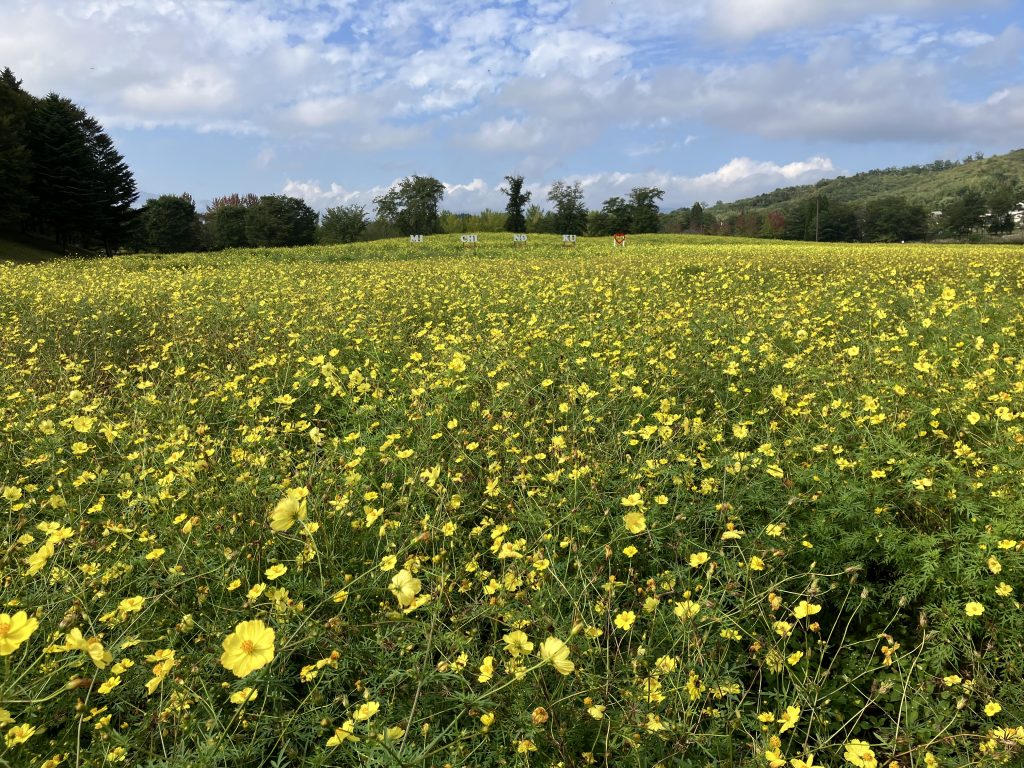 蔵王連峰を背景に、鮮やかなレモンイエローのコスモスが一面に広がっています。