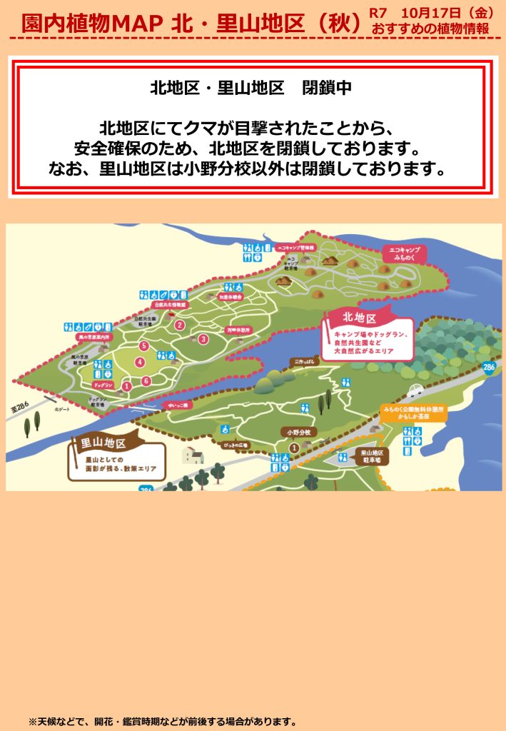 北地区にてクマが目撃されたことから、10月10日(金)より当面の間、安全確保のため北地区を閉鎖しています。