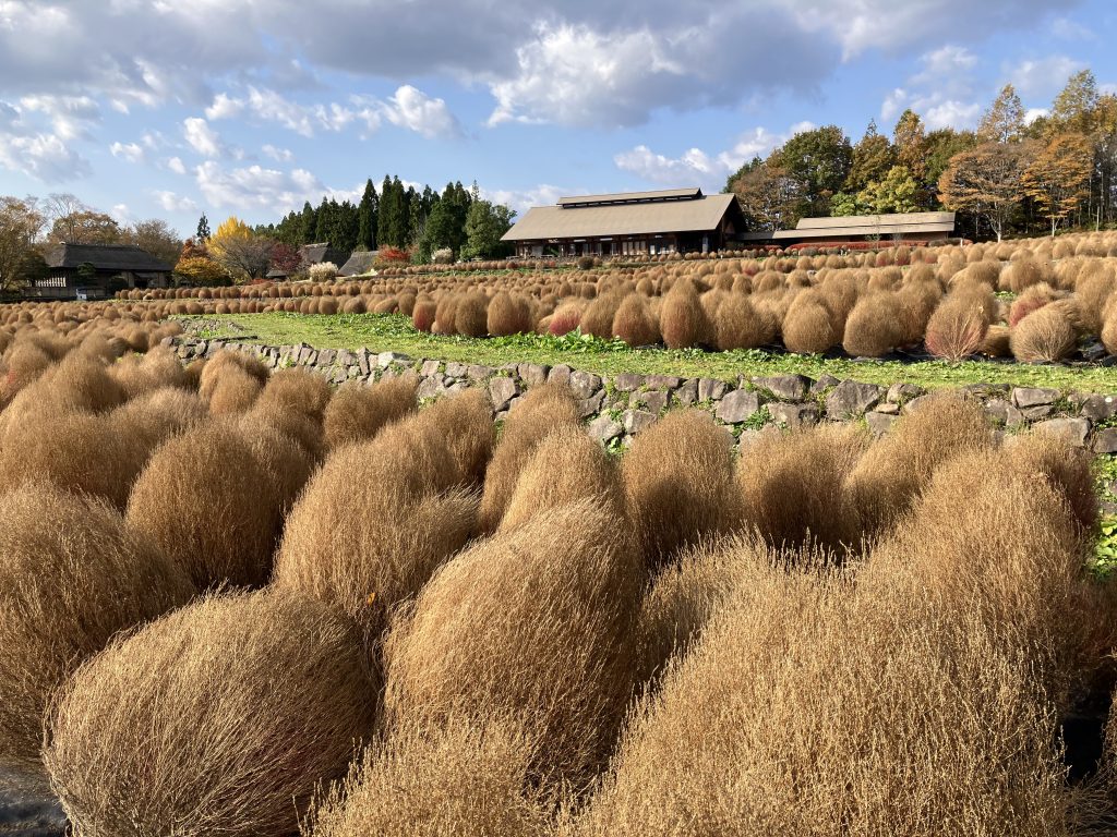 だんだん畑のコキアの見頃(紅葉)は終了しましたが、小麦色のコキアはご覧いただけます。