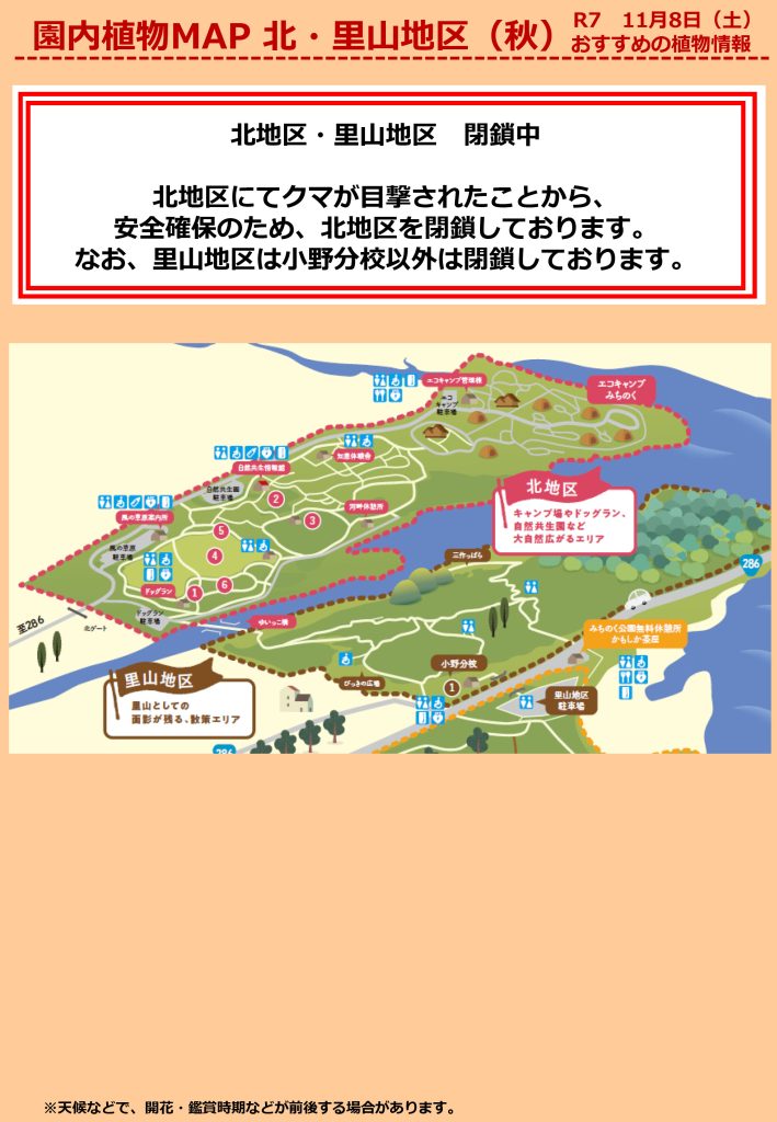 クマが目撃されたことから、安全確保のため北地区と里山地区の小野分校以外は閉鎖しています。(11月8日現在)