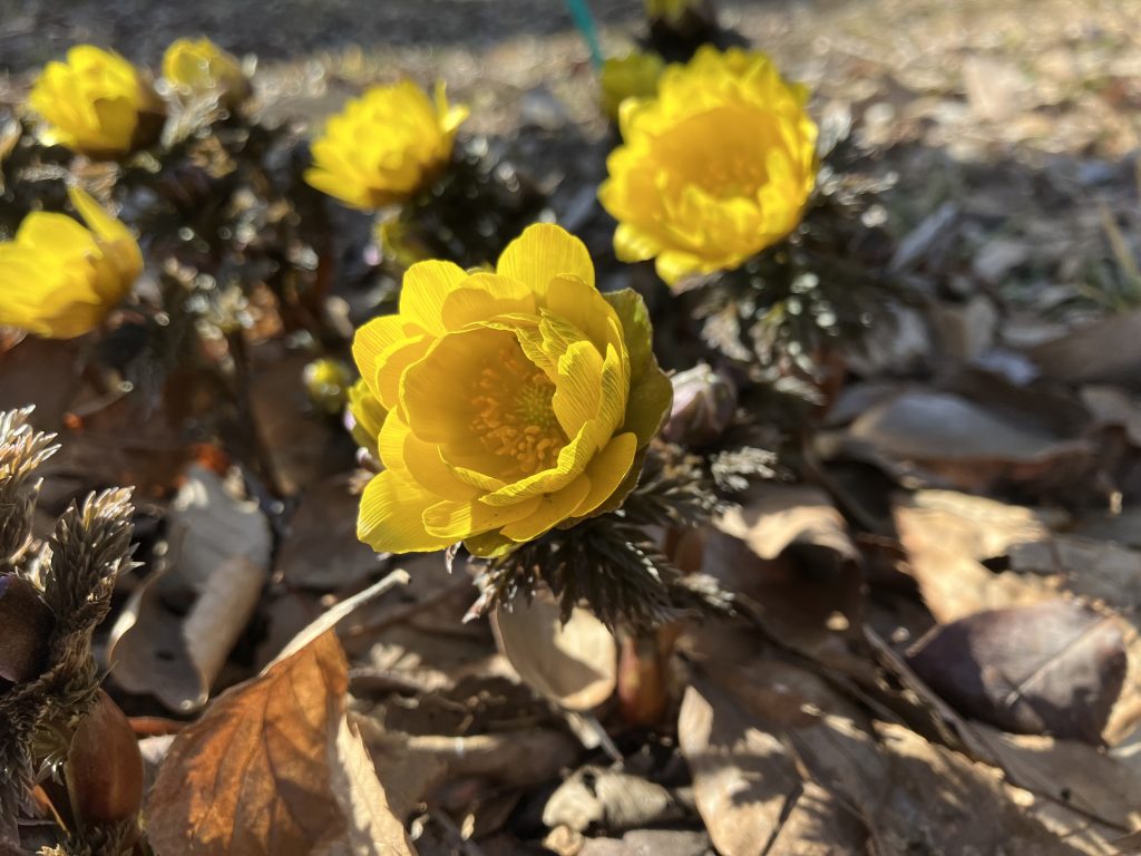 花木園の奥にある前川てんぼう台の近くで、フクジュソウが咲始めました。