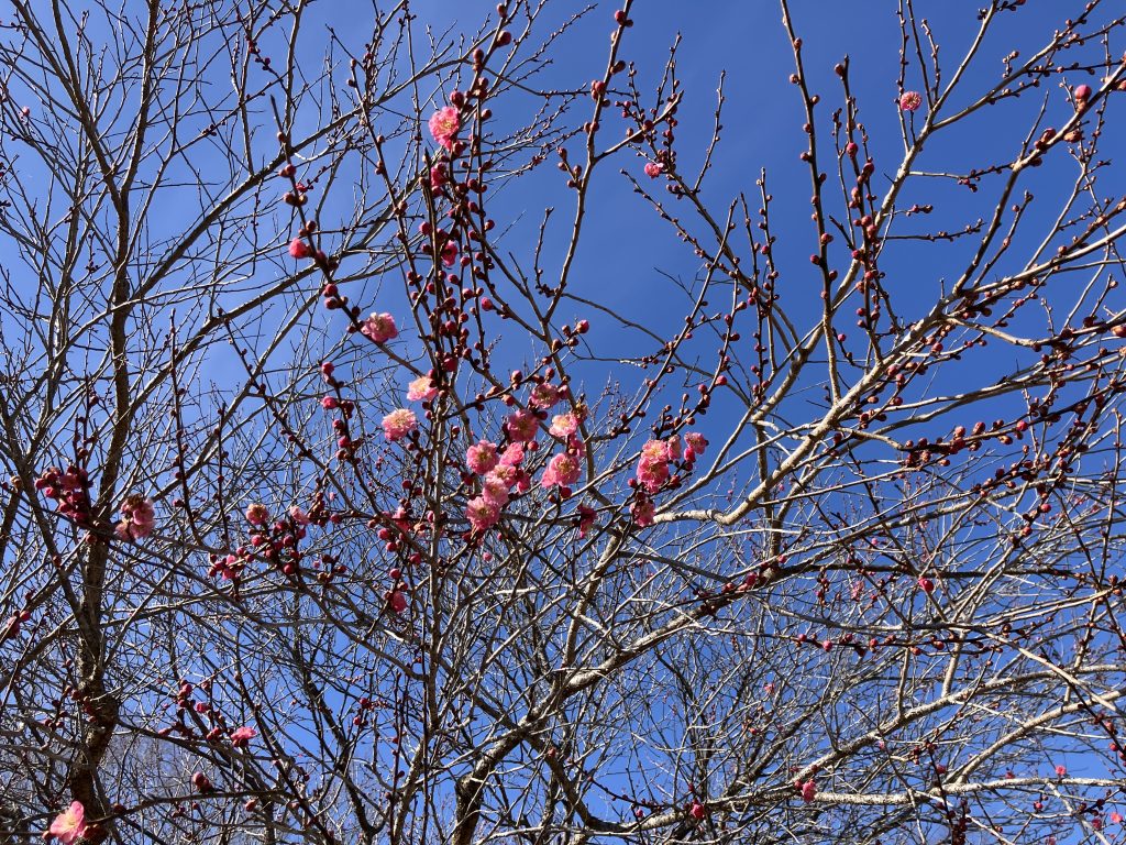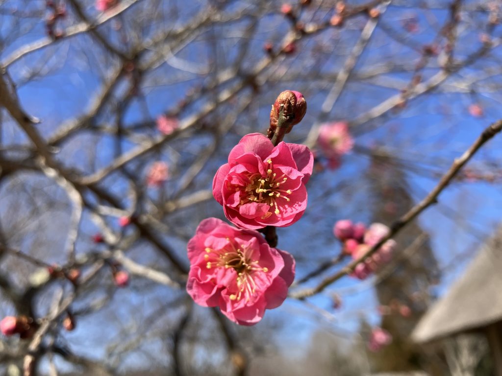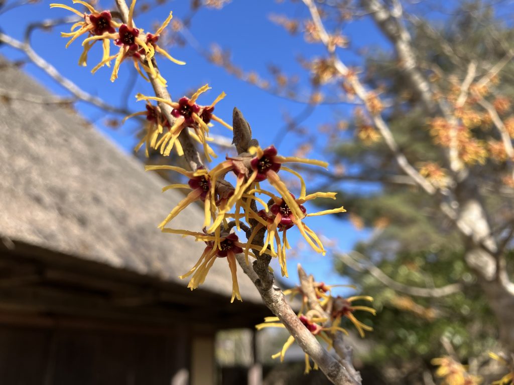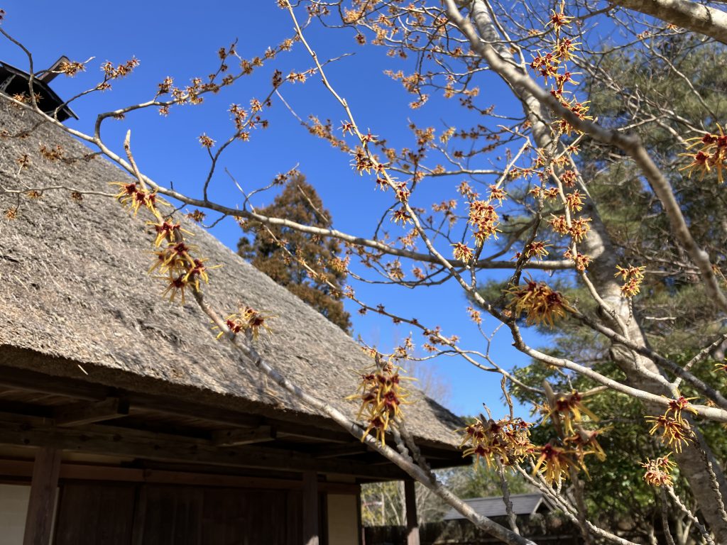 ふるさと村 遠野の家にて、マンサクが見頃始め、ウメが咲始めています。