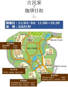 ふるさと村の古民家に宮城・山形・福島の珈琲専門店が大集合!『古民家で珈琲日和』を開催します。スペシャリティコーヒーをはじめ、お菓子・スイーツ小物雑貨、お食事などが揃います。古民家の懐かしい雰囲気の中、ゆったりとした時間をお過ごしください。また、音楽イベント『ふるさとLIVE』、夜間ライトアップイベント『みちのくふるさと秋灯り』もお楽しみいただけます。